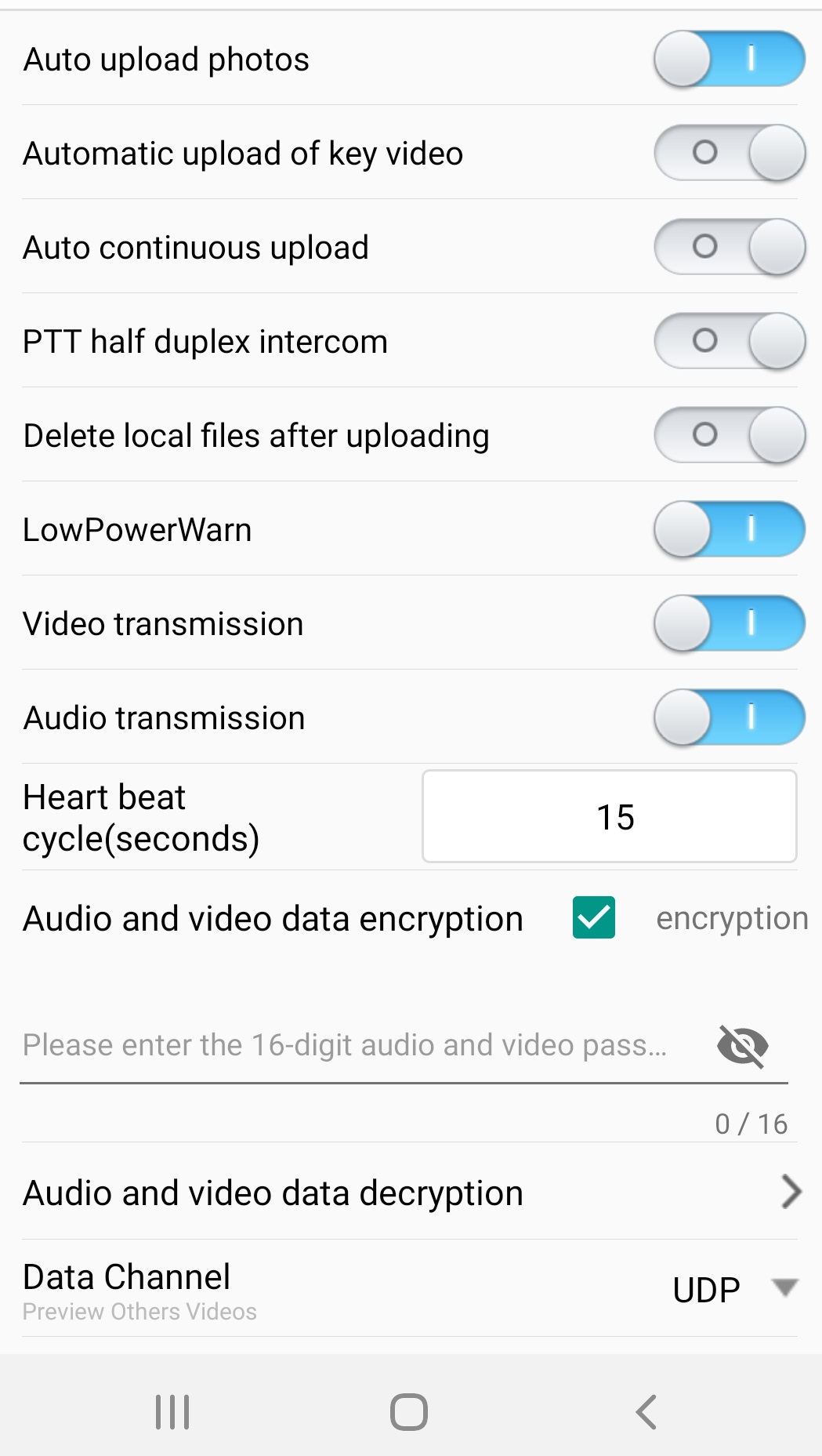 Umfangreiches Menü mittles Smartphone App für Einstelluingen wie automatische Internetverbindung und Videoaufzeichnung bei Einschalten.,