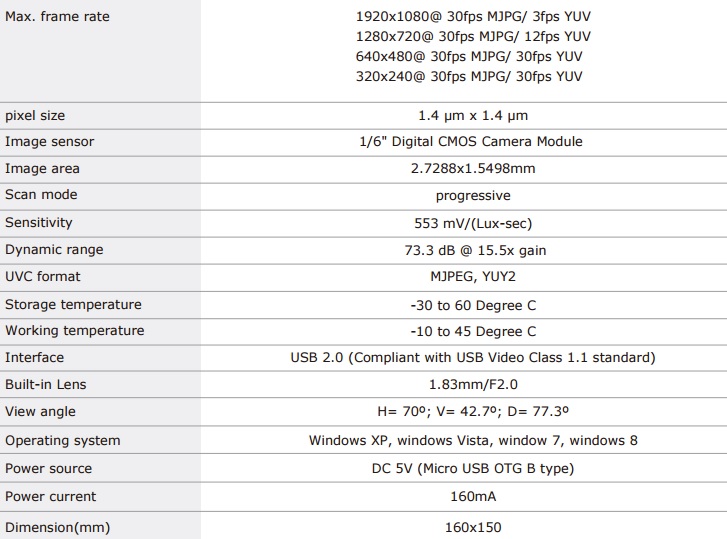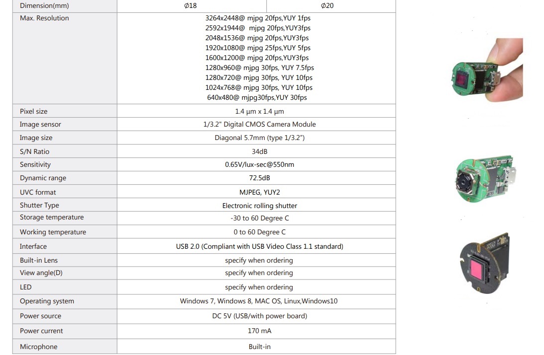 640x480/30fps, 640x360/30fps, 320x240/30fps, 320x180/30fps H.264, MJPEG, YUV